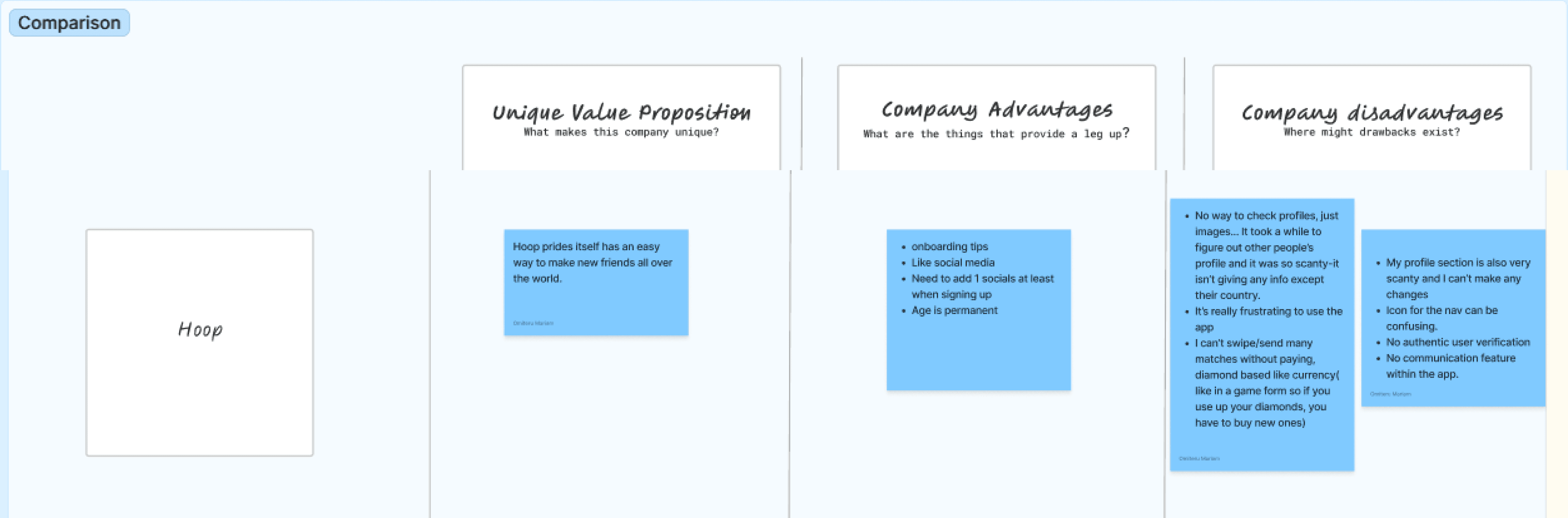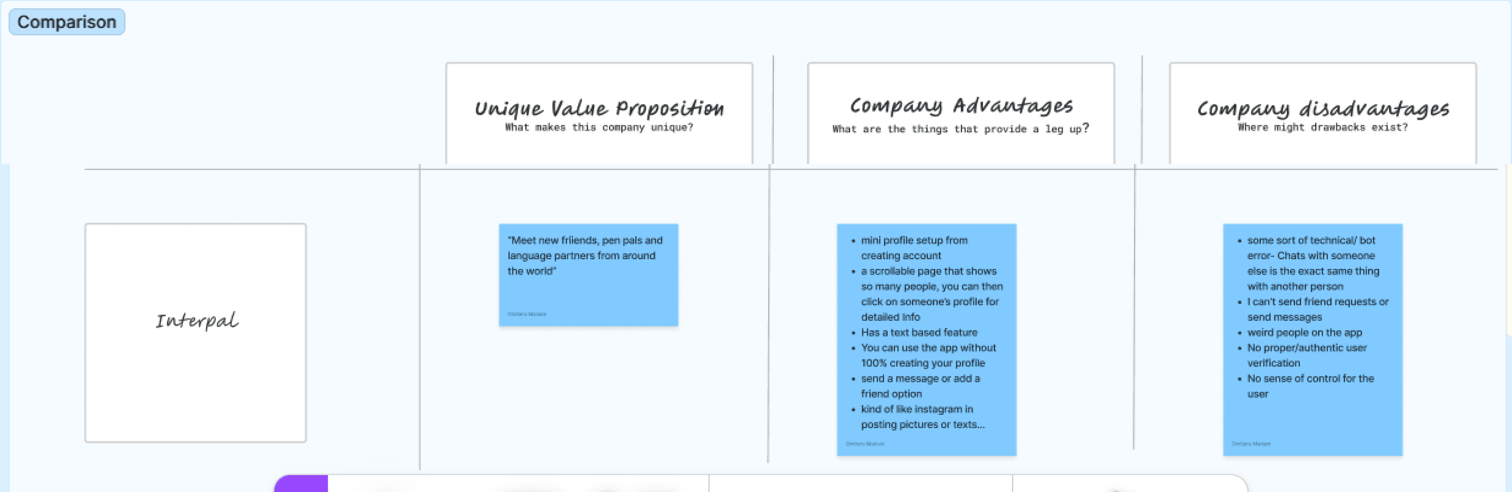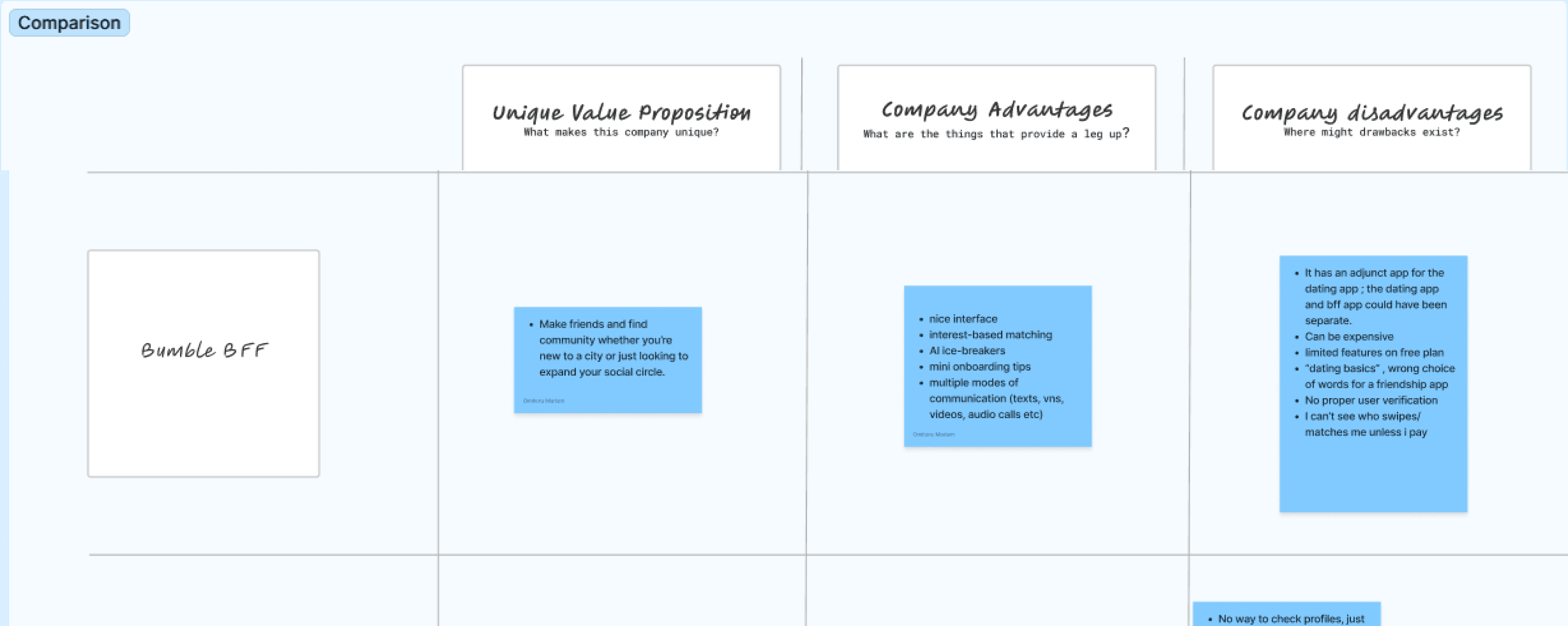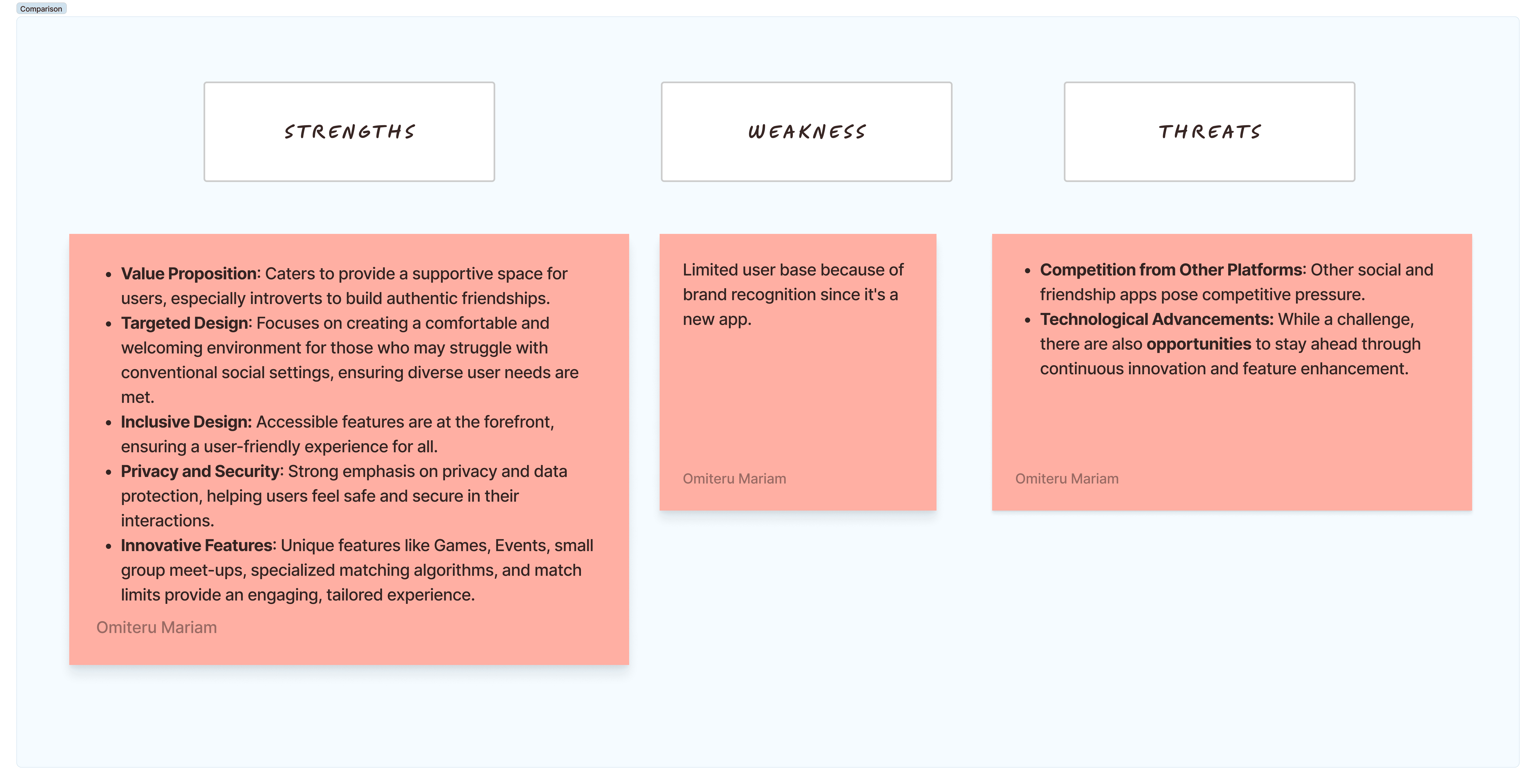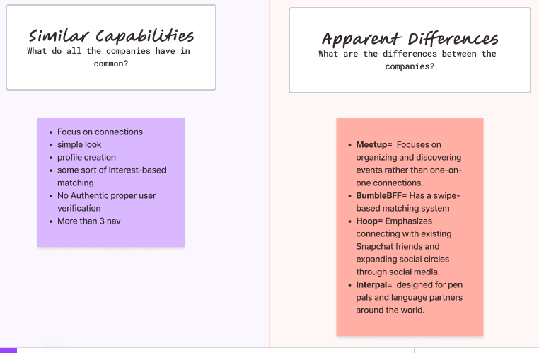 I analyzed four key competitors to identify strengths, weaknesses, and opportunities for Amigo. This helped refine Amigo's unique features and ensure it offers a valuable, differentiated experience for users. For example, where other apps lacked privacy features or felt impersonal, Amigo emphasized security and authenticity.