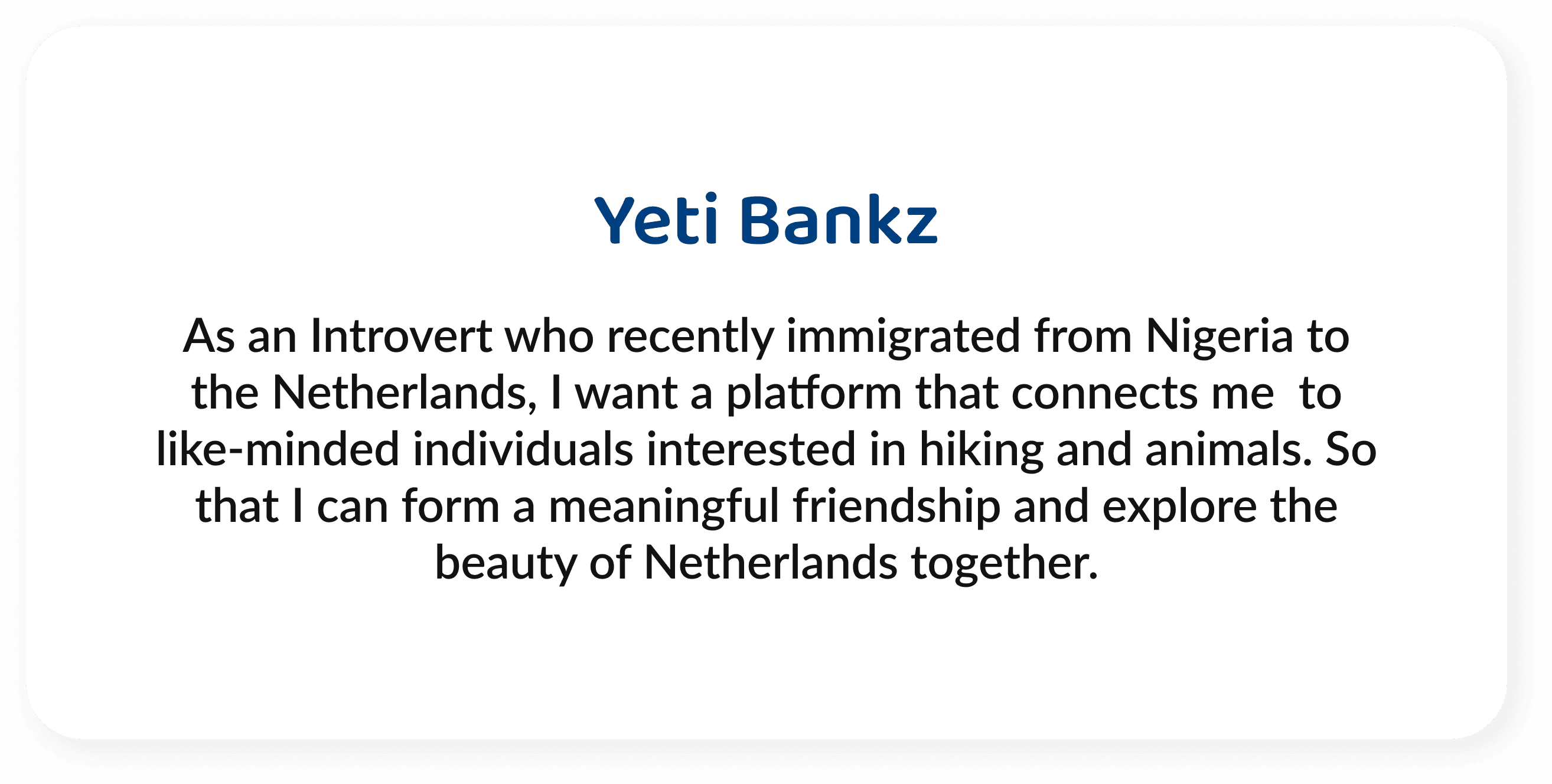 From Research, recent immigrants, introverts and people who struggle with social anxiety are our main target audience. While these groups are the app’s primary focus, Extroverts will also find value in the platform. Specific features cater to the needs of these groups to ensure a diverse and inclusive space for all users.