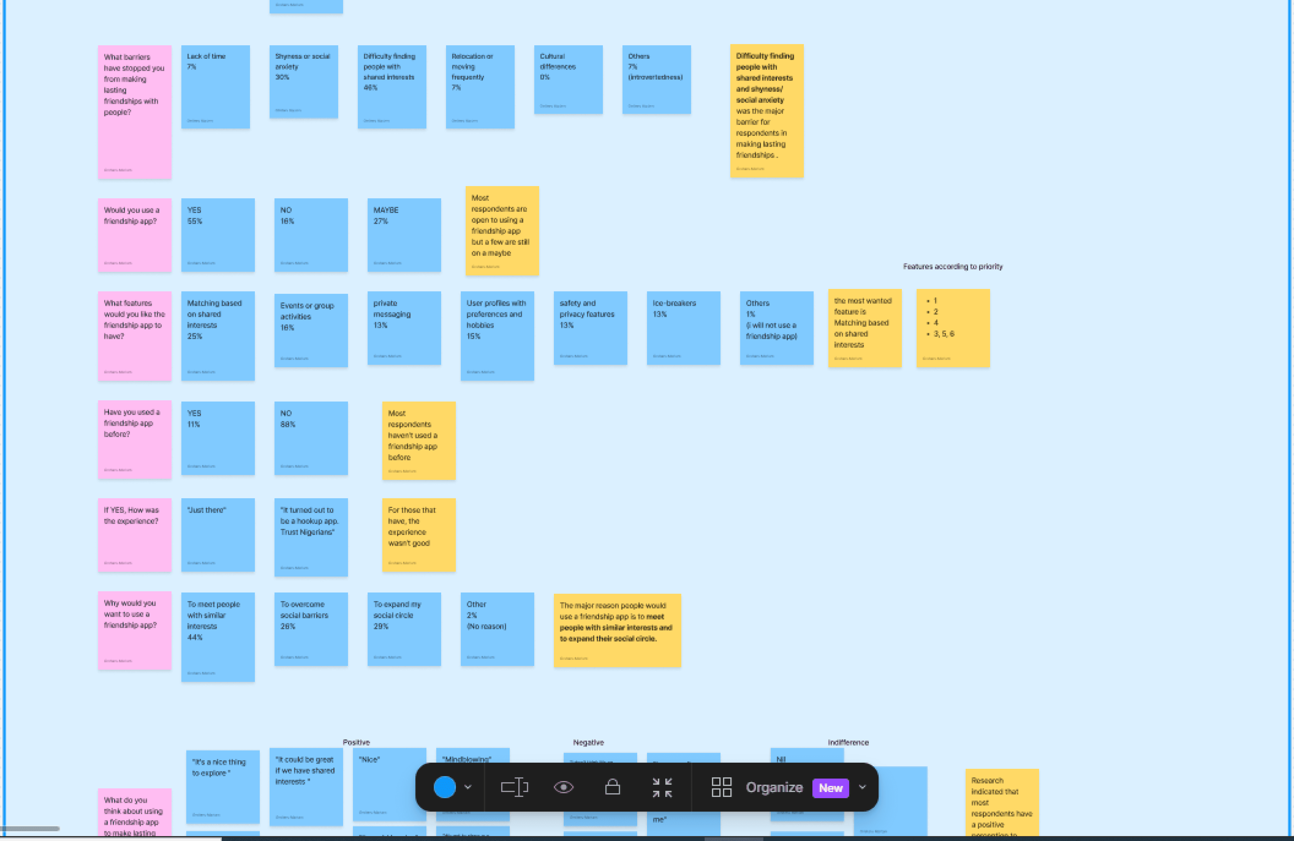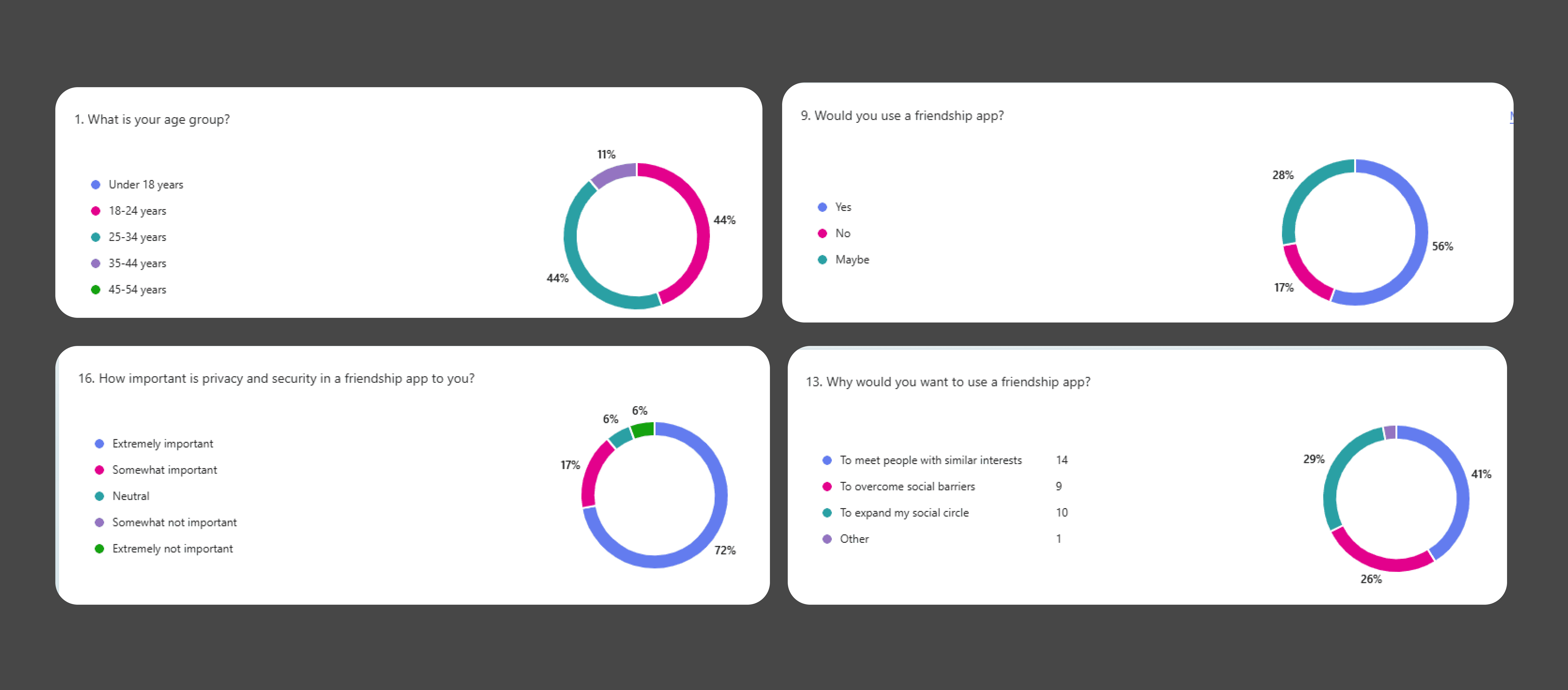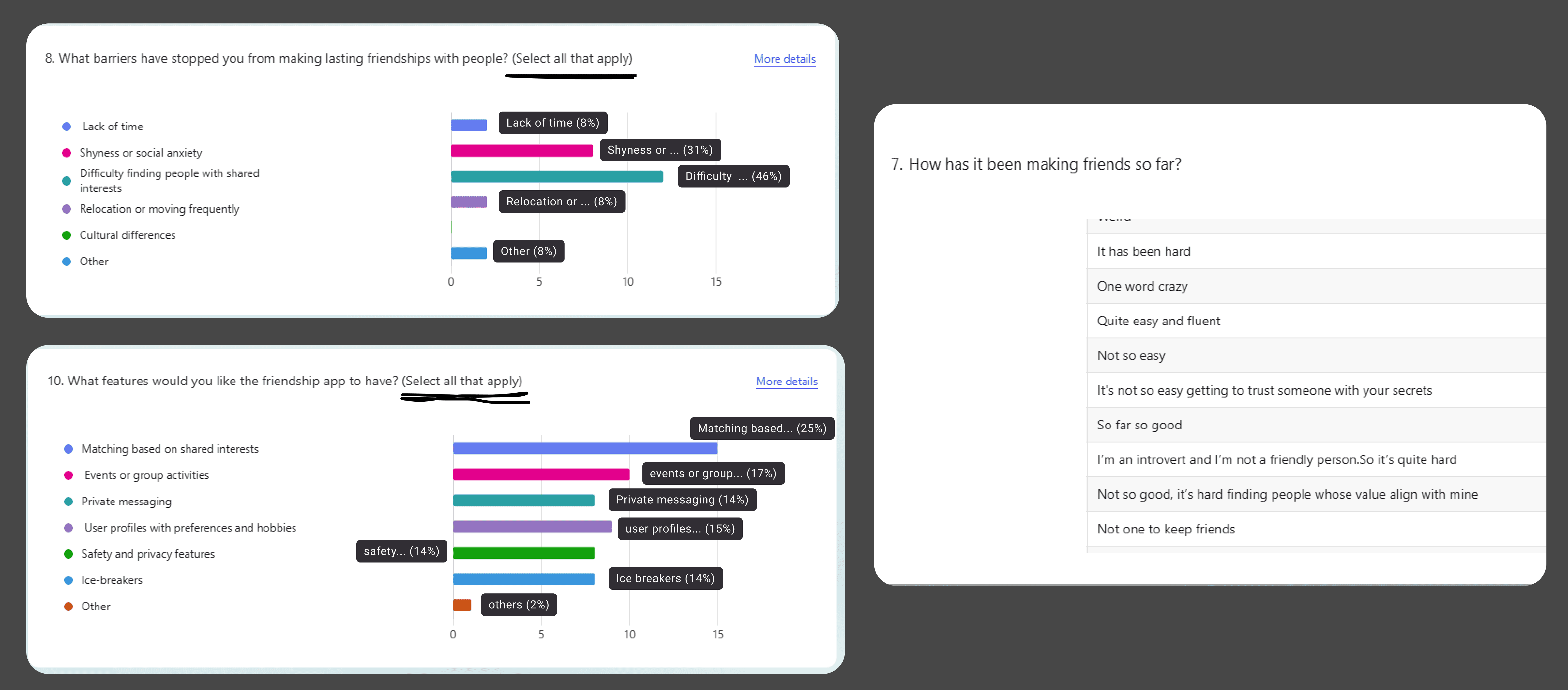 This research aimed to uncover the motivations behind seeking friendship solutions, analyze successful strategies employed by existing platforms, and explore historical barriers to forming meaningful connections. By understanding user needs, preferences, and past challenges, the goal was to design a comprehensive, user-centric solution that addresses pain points and fosters genuine, lasting friendships.