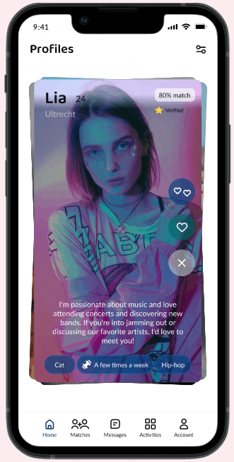 The profile browsing screens were designed to provide users with essential details at a glance, while maintaining a clean, engaging layout. Every interaction, from swiping to exploring detailed profiles, aims to create a seamless and enjoyable experience for discovering potential connections.