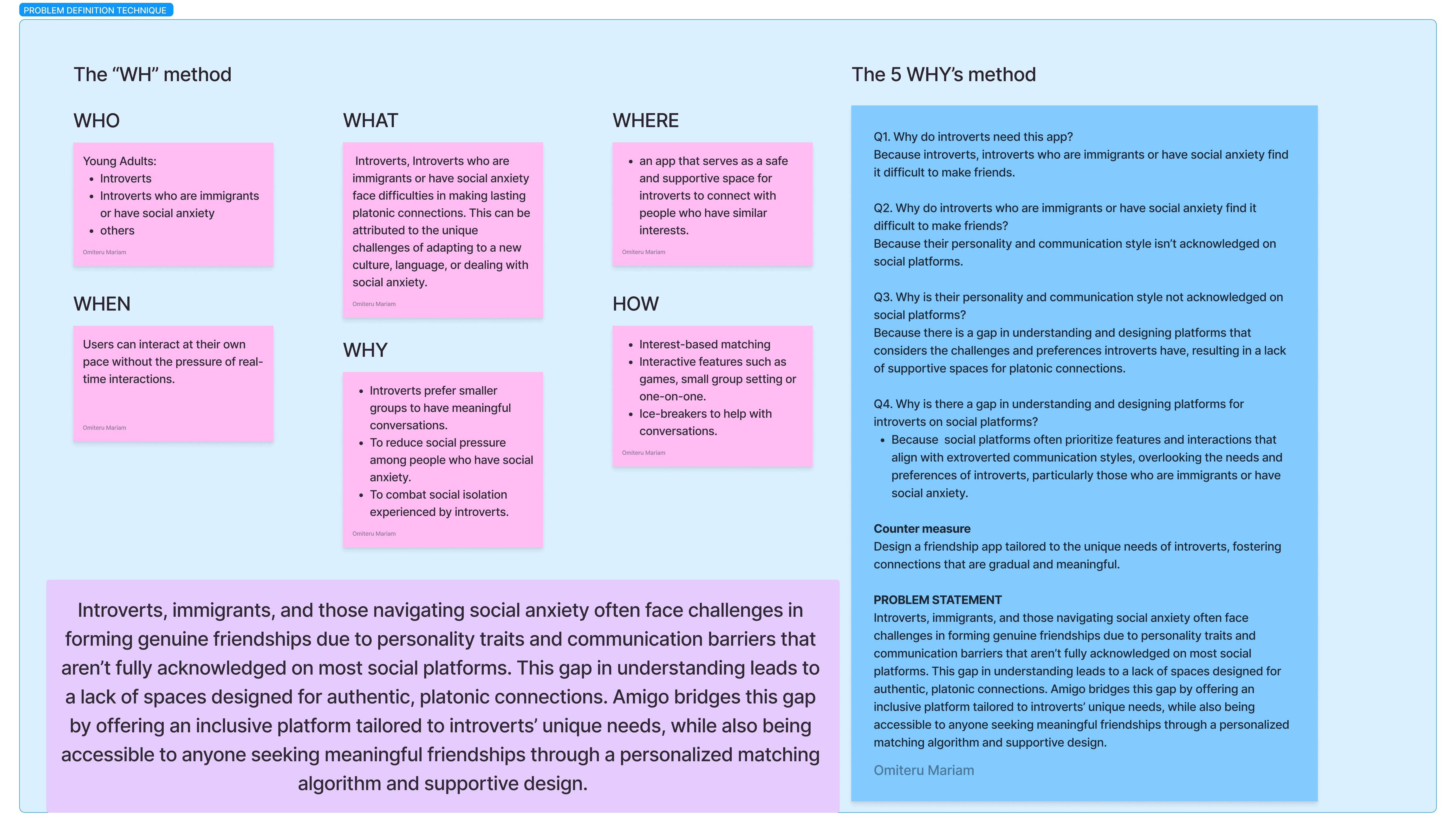 To ensure the solution addressed the root of the problem, I employed the 5 Whys technique and the WH method to come up with Amigo's "Problem Statement". This approach allowed me to dig deeper into the survey insights and research data, unraveling the underlying causes behind users’ struggles to form meaningful connections. By asking the right questions and exploring why and how these issues exist, I was able to craft a clear and focused problem statement.